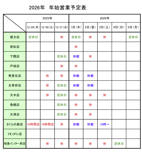 年末年始営業予定表 2025年11月28日 itsstylehd 日頃よりご利用いただき誠にありがとうございます各店舗の年末年始の営業を下記の通りご案内申し上げます。お客様へご迷惑おかけいたしますが何卒よろしくお願いいたします